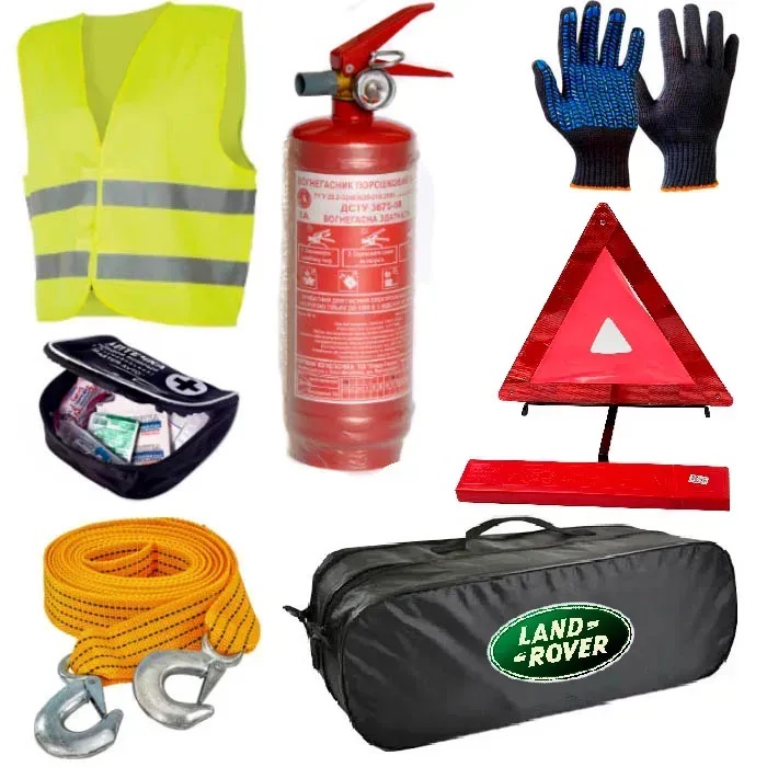 Набір автомобільний (Вогнегасник, аптечка, знак аварійної зупинки, буксирувальний трос, перчатки, жилет світловідбивний)