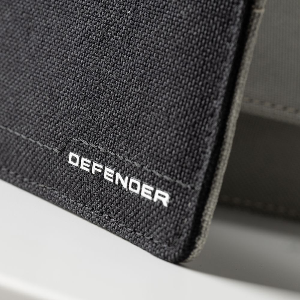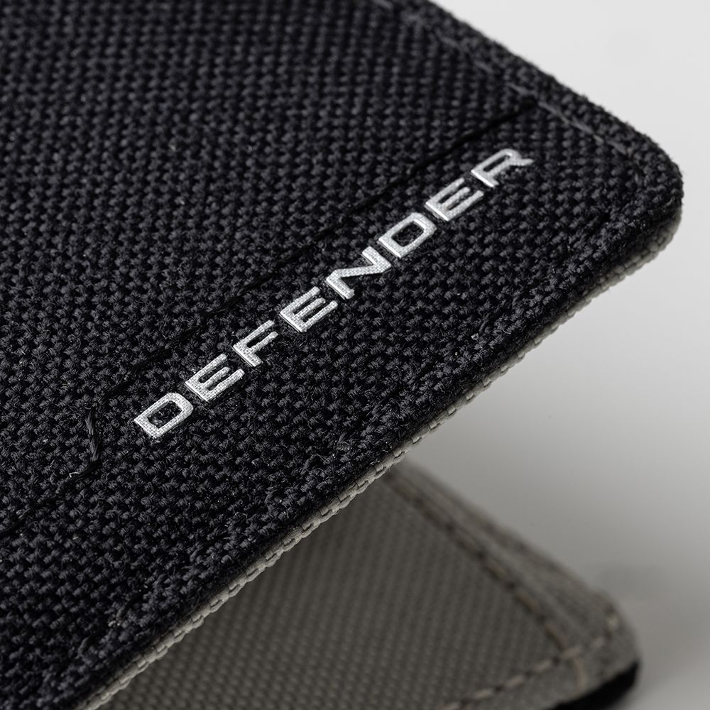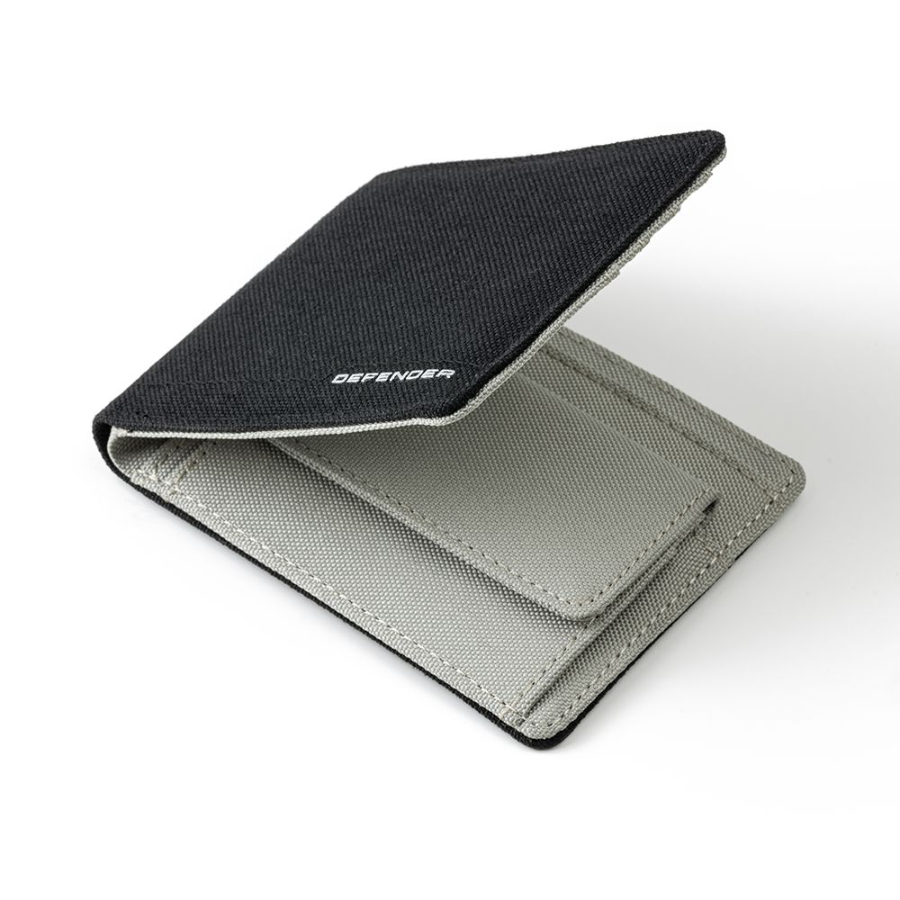Текстурований гаманець із написом Defender. Контрастно-сіра внутрішня частина з місцем для трьох карток і кишенею для монет.