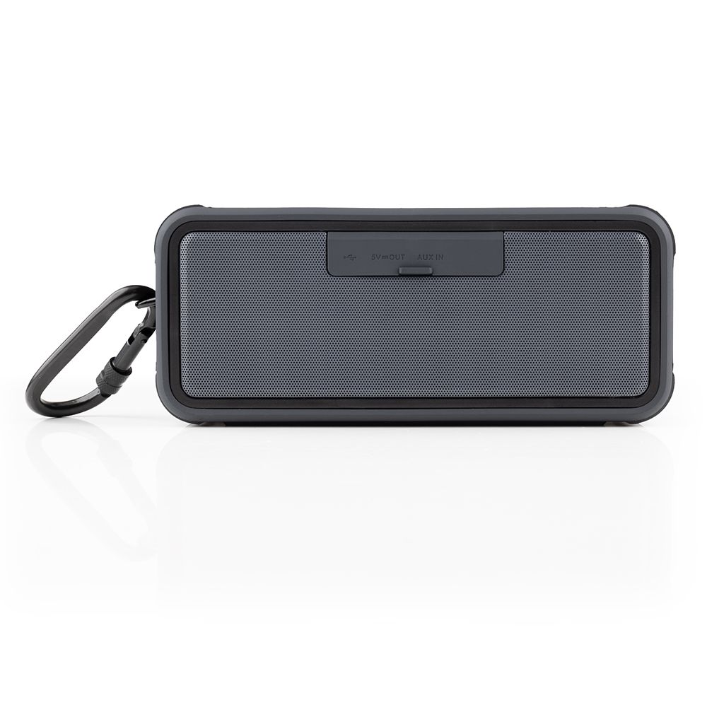 Цей багатофункціональний динамік Bluetooth досить компактний, щоб брати його куди завгодно. І досить міцний, щоб витримувати удари. Посилена портативна конструкція. Ударостійкий. Карабін кріпиться до сумок. Сполучення NFC. USB зарядка. Функціонує як пауербанк і мобільний гучномовець.