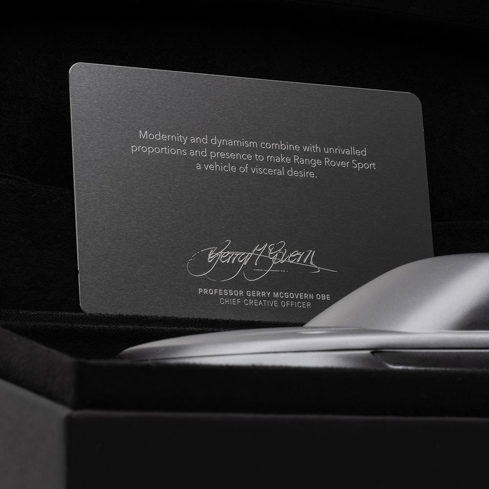 Втілення спортивної розкоші з характером, ця 15-сантиметрова цільна скульптура виготовлена з алюмінію, унікальним чином передаючи ідеальні пропорції Range Rover Sport у мініатюрі. Анодована поверхня кольору Eiger Grey, вона постачається в подарунковій коробці з сертифікатом автентичності.