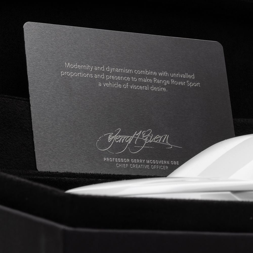 Втілення спортивної розкоші з характером, ця 15-сантиметрова цільна скульптура виготовлена з алюмінію, унікальним чином відображаючи ідеальні пропорції Range Rover Sport у мініатюрі. Пофарбована в білий колір, вона постачається в подарунковій коробці з сертифікатом автентичності.
